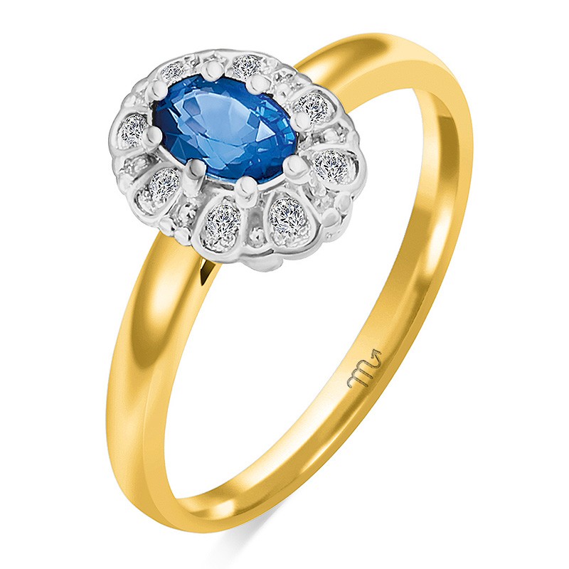 Piękny, złoty pierścionek z naturalnym szafirem i brylantami, idealnie nadający się na pierścionek zaręczynowy